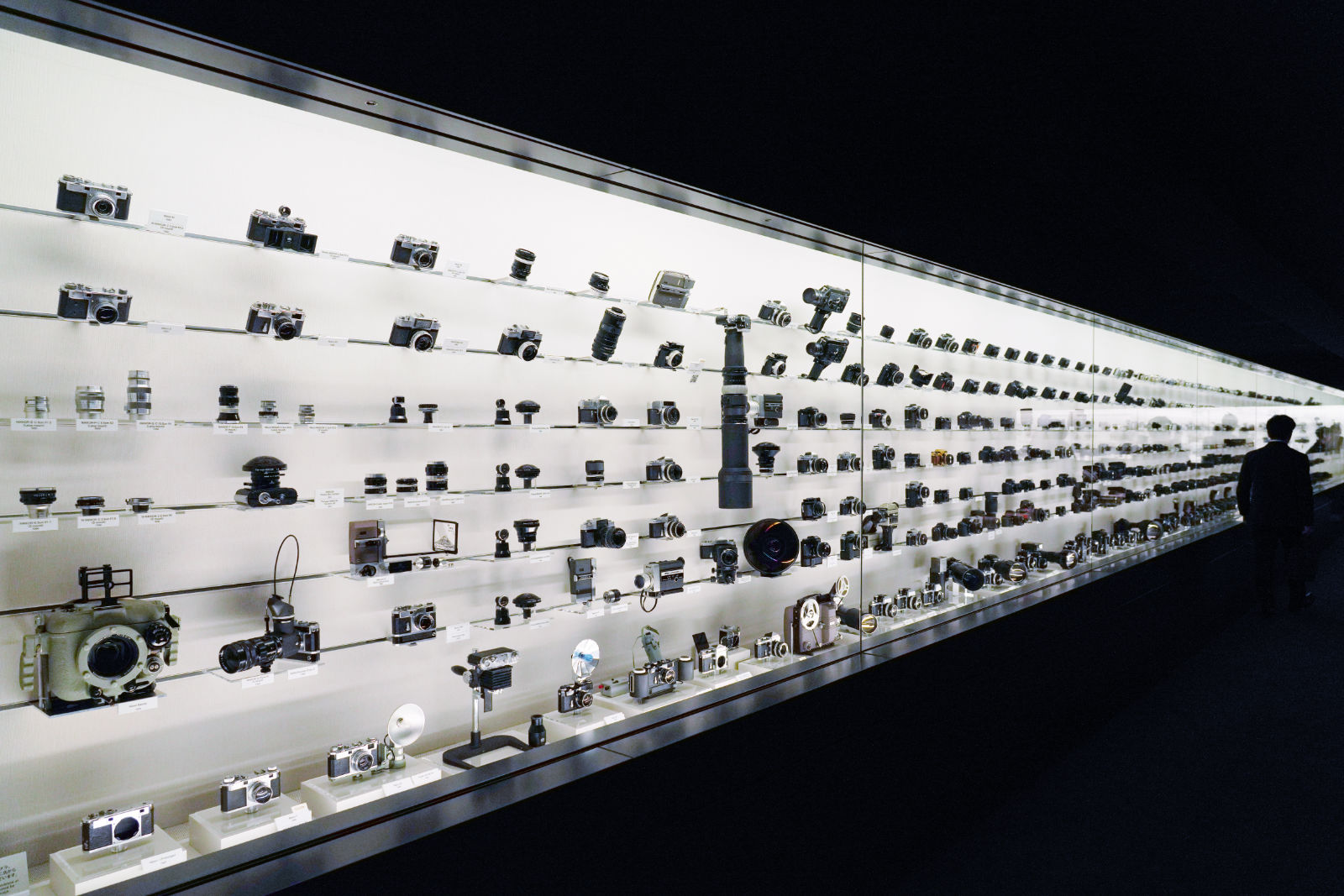 カメラ展示コーナー。歴代のカメラが年代順に並ぶ。